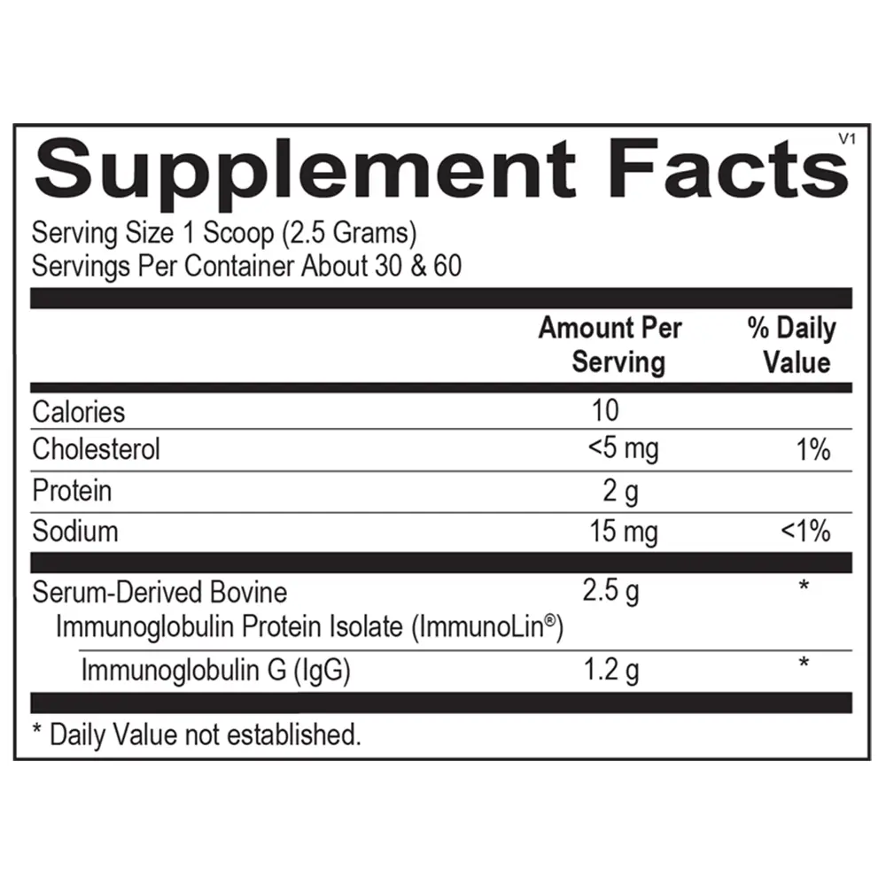 Formulated with serum-derived bovine immunoglobulins (SBI), this powder provides concentrated IgG in a well-tolerated, allergen-free form. Research highlights its ability to promote microbial balance, help maintain normal inflammatory responses, and reinforce the body’s natural defenses.