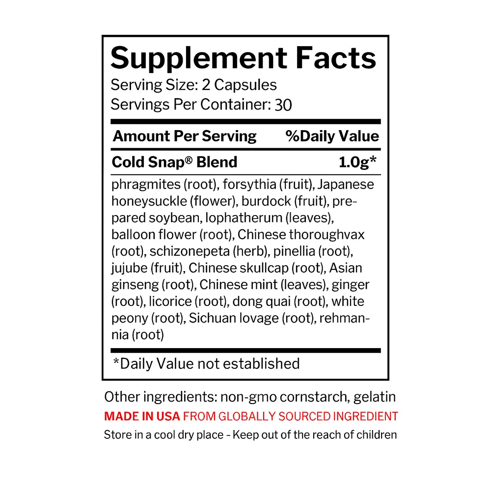 Cold Snap offers a time-tested herbal formula that utilizes 20 botanicals, including chrysanthemum, dong quai, scullcap, licorice, and ginger, to help maintain immune harmony without overstimulation.
